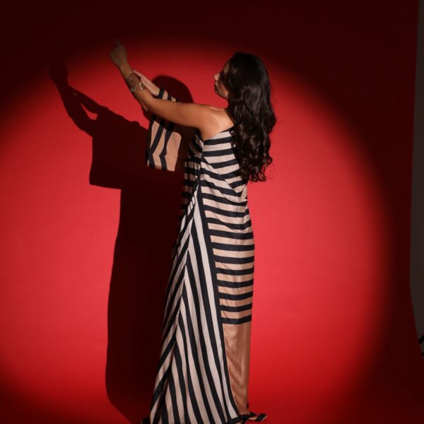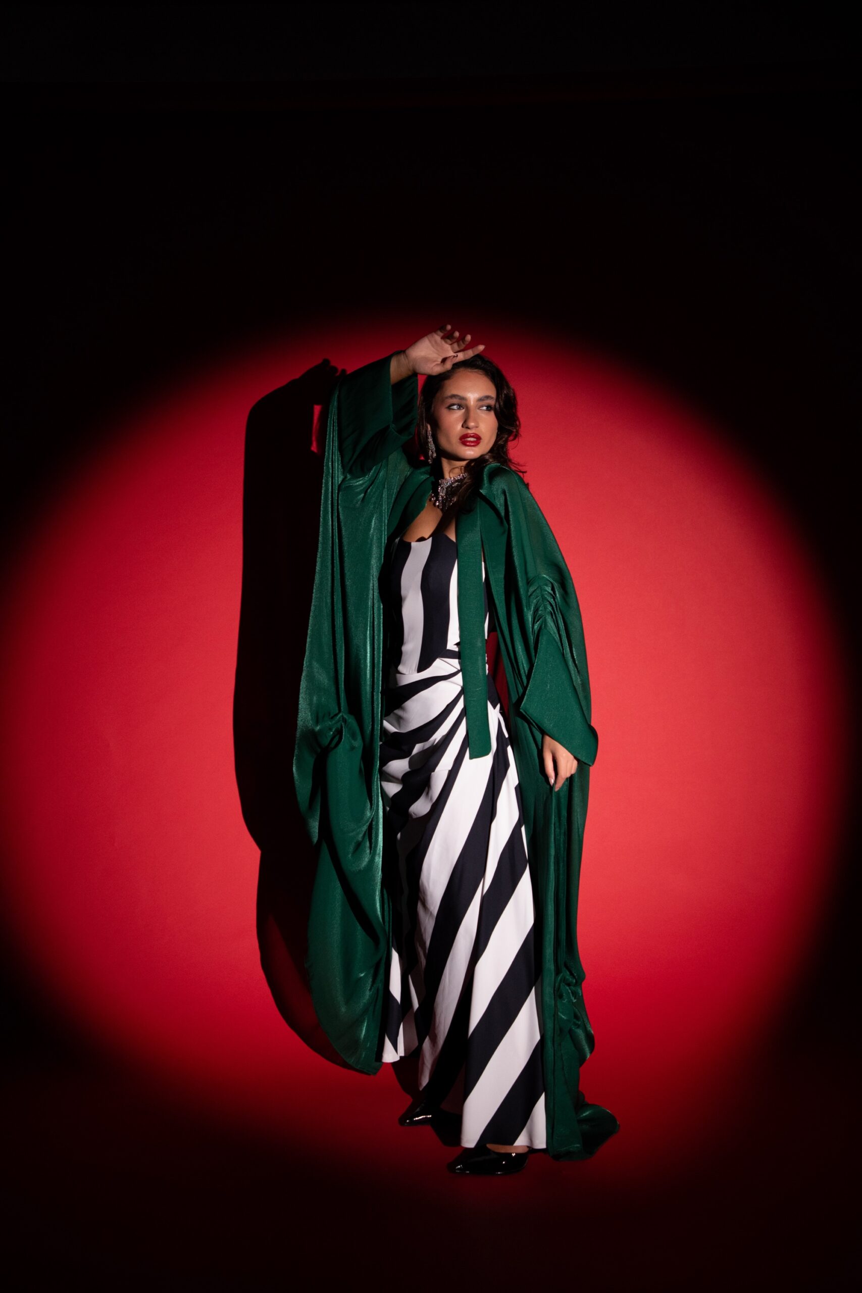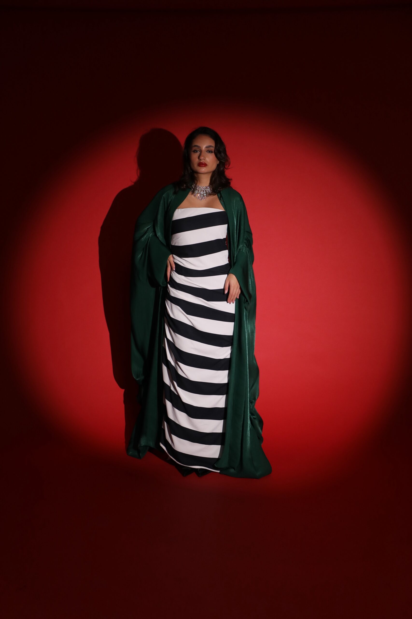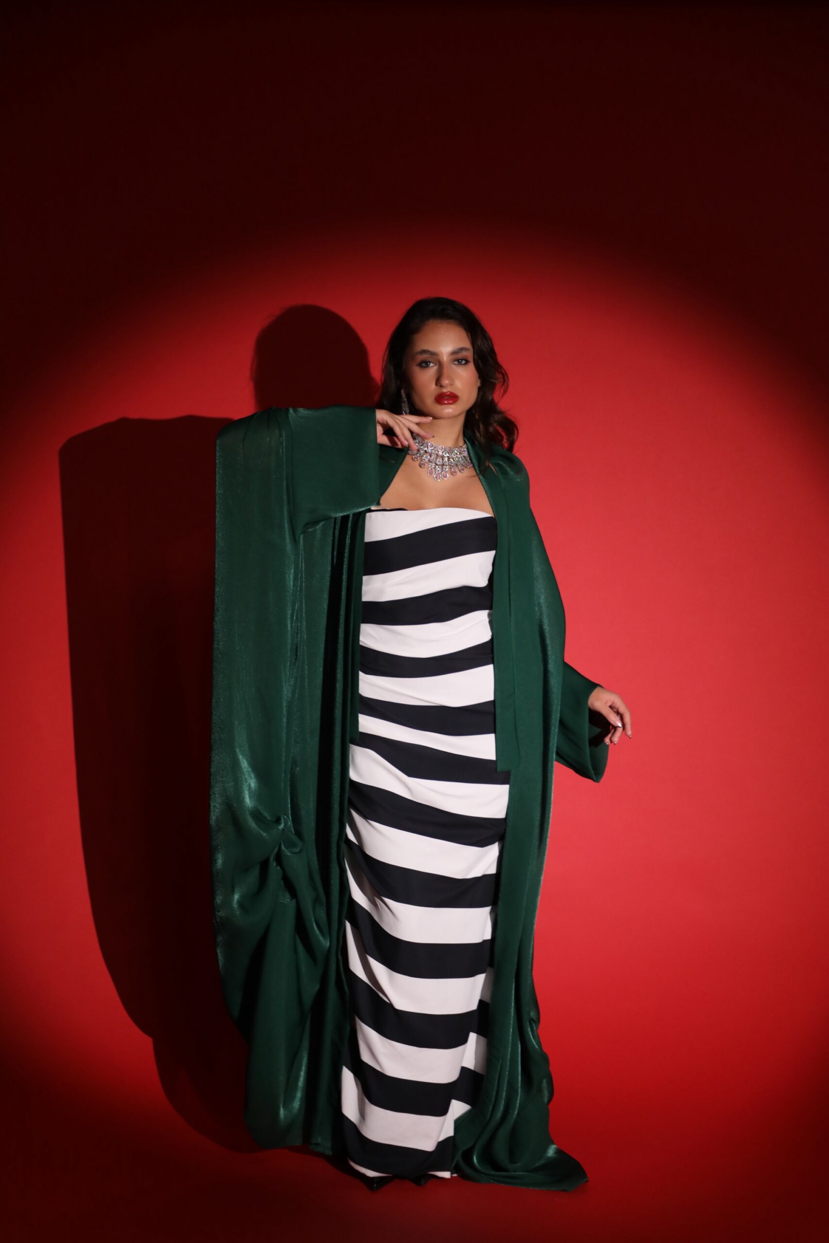 A set featuring black striped skirt & corset top creating beautiful modern patterns paired with a stunning green Bisht.